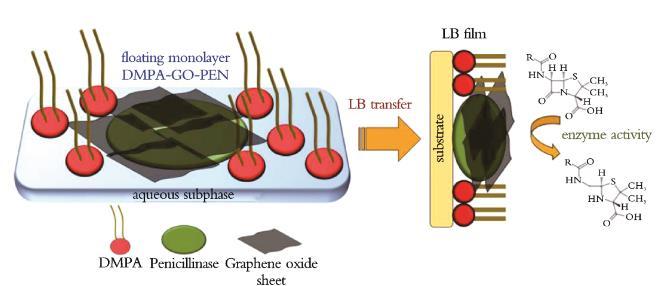 此外,將經典兩親分子的Langmuir單層與酶結合是保持生物大分子催化性能的一種方式。F.A.SCHLL等研究了磷脂LB膜固定化青黴素酶(PEN),將GO加入青黴素酶‐脂質Langmuir單層膜中,並作為LB膜轉移到固體載體上,評估了酶的催化性能(見圖3)。結果表明,GO作為由2,2‐二羥甲基丙酸(DMPA)和PEN組成的LB膜的添加劑,被固定在LB膜的PEN中;GO存在於酶脂LB膜中,不僅可以調節青黴素酶的催化活性,而且有助於數周後仍保持其酶活性。研究結果加強了混合納米結構薄膜的重要性,證明了使用由脂質、GO和酶組成的LB膜應用於光學生物傳感器的可行性,對應用傳感器的生物電子設備研究具有重要意義。