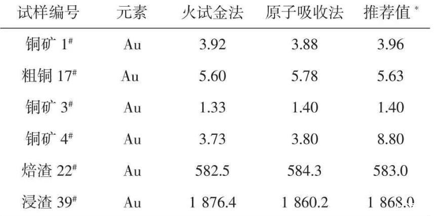 按試驗方法,用不同含量的銅物料樣品進行分析,並與其它測定金元素方法的分析結果對照,結果見表5。