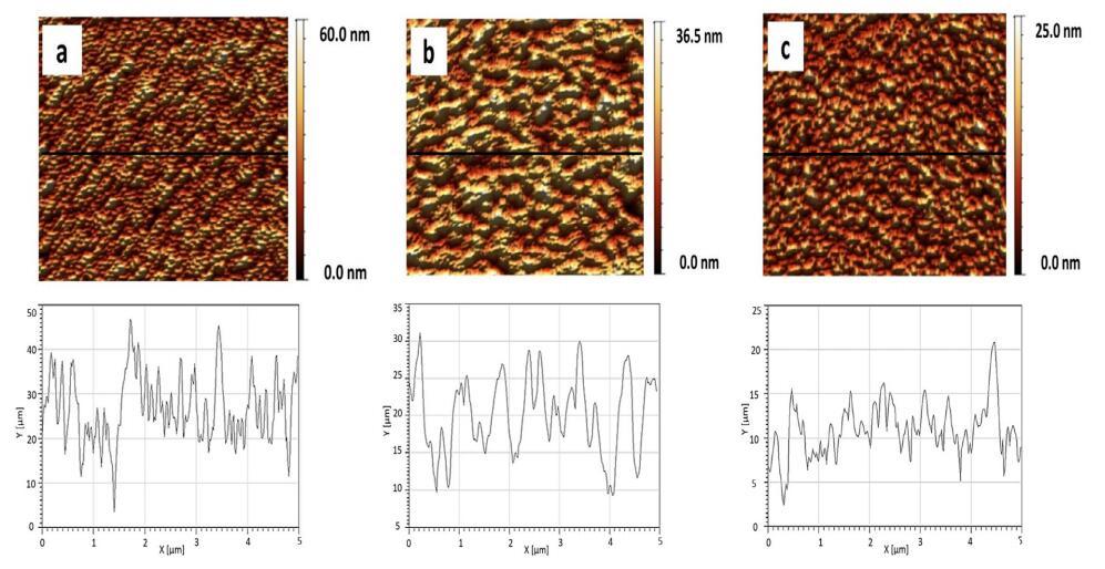 圖 9 顯示了純磷脂單層的 AFM 圖像 在 p = 20 mN/m 時轉移。 純磷脂顯示出均勻的 均方根 (rms) 等於 0.219 nm 的圖案, DPPG、DPPE 和 DPPC 分別為 0.060 nm 和 0.054 nm (圖 9)。 91视频网址软件獲得了 rms ~ 0.045 nm (XCMR = 0.87) 相當於 光滑的單層形貌(圖 10a)。 另一方麵, CMR/DPPE 和 CMR/DPPC 薄膜對應於粗糙表麵 rms 分別為 0.1754 nm 和 0.072 nm(圖 10b 和 c)。 測量重複三次,rms 的標準偏差約為 5%。