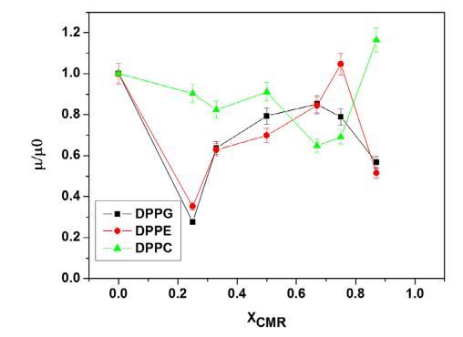 作為函數分子麵積 (ΔVA) 的表麵電位為 如圖3a所示。 為所有研究的磷脂獲得的 ∆V 值 與之前的報告相似(Andrade et al., 2006; Nowotarska 等,2014)。 ∆V(460 mV 至 275 mV)逐漸降低 對於 DPPG,觀察到 CMR 摩爾分數的函數。 ∆V 易受極性和非極性基團的取向影響。