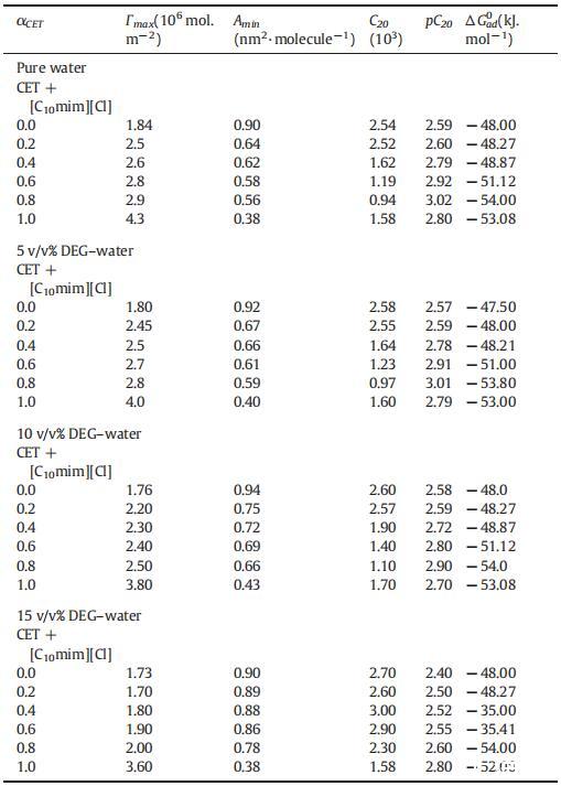 表4純CET、[C10min][Cl]和CET+[C10min][Cl]混合物的表麵過剩(Γmax)、每分子最小麵積(Amin)、吸附效率(pC20)和吸附自由能(ΔGad 0),作為純水中CET摩爾分數α的函數,並且在T=298.15K時存在不同體積百分比的二元DEG-水混合物。