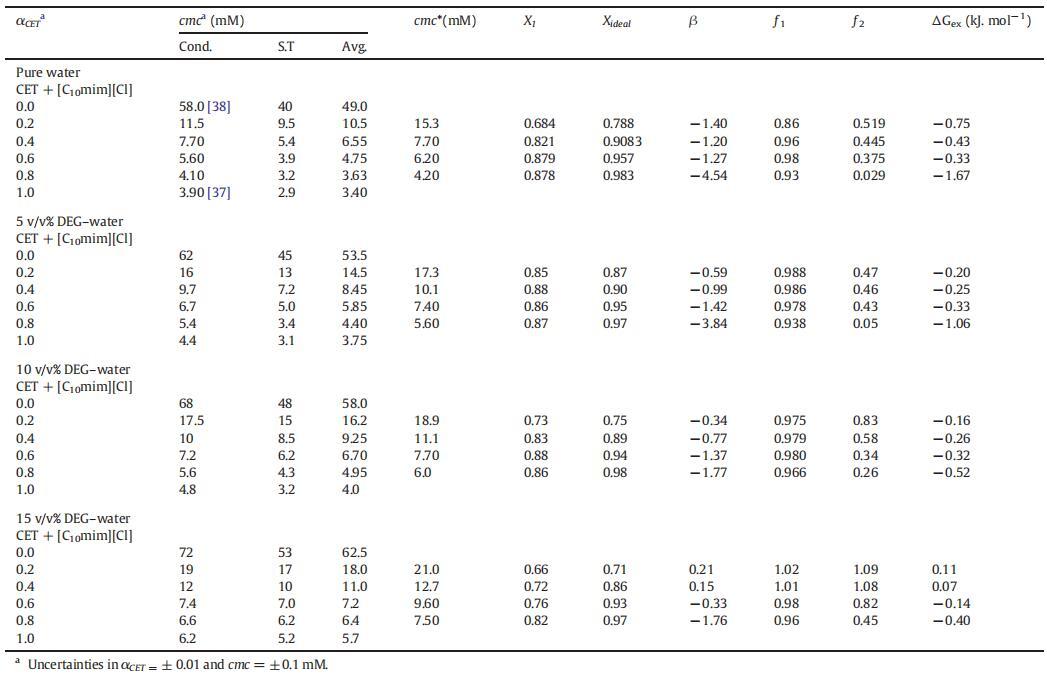 表1列出了根據式(3)計算的純水中的β值。在存在不同體積百分比的二甘醇-水二元溶液的情況下,也測定了類似值,如表1所示。β的值可以是正(拮抗作用)、負(協同作用)或零(組分之間無相互作用)[51]。此外,β的負值意味著IL和表麵活性劑之間的吸引力大於單個組分之間的吸引力。從表1可以看出,對於所有二元混合物,β值均為負值,然而,隨著DEG的量從5增加到15 v/v%,負值減小,令人驚訝的是,對於αCET=0.2和0.4,β值均為正值。β的負值通常是混合膠束中有利相互作用的原因,然而正值意味著不利相互作用[53–54]。因此,從表1中可以看出,作為膠束形成主要力量的協同作用隨著DEG量的增加而減少。這種下降的原因可能是DEG的結構破壞能力導致單體之間的疏水相互作用減少,從而降低了它們的協同作用。