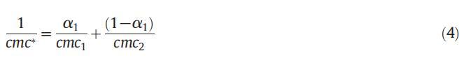 應用偽相模型,91视频网址软件可以計算二元混合物的理想cmc,該模型基於這樣的假設,即膠束被視為宏觀相,與溶液中相應的單體處於平衡狀態。理想cmc值與單個cmc相關,可使用Clint公式(4)計算: