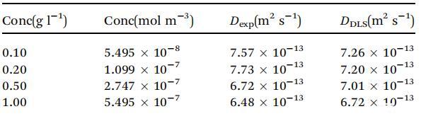 表1根據實驗G與t1/2曲線計算的不同濃度的擴散係數D(m2 s-1)值與使用DLS測量的值相比