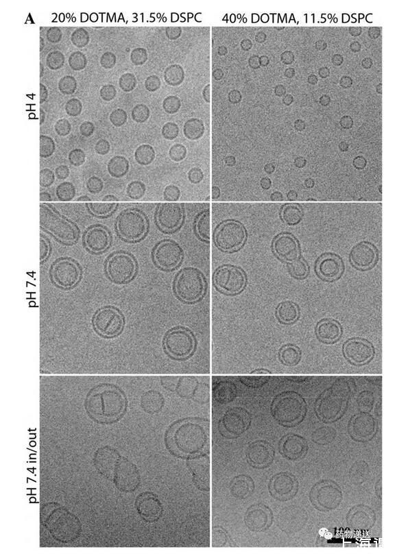 此外還發現,采用乙醇稀釋/快速混合技術製備LNP-siRNA,當siRNA含量較高時,表現為堆疊的小雙層結構,其中siRNA被包載於緊密相連的脂質雙分子層之間;當siRNA含量較低時,堆疊結構的比例降低,LNP-siRNA複合物係統則表現出siRNA雙層結構和非晶態電子致密核的組合,這可能是由中性形式的可電離陽離子脂質產生的油滴而形成。所得結論為:含可電離陽離子脂質的LNP體係在pH=4時形成雙層結構,在pH=7.4時形成非晶態“固體核”結構。