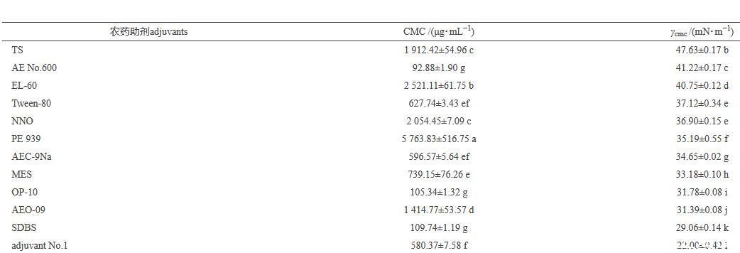 從表2中可見:不同種類的助劑具有不同的臨界膠束濃度(CMC)和臨界膠束濃度時表麵張力(γcmc),與其對照(水)相比各助劑臨界膠束濃度時的表麵張力均小於水的臨界表麵張力[(72.75±0.01)mN/m],並存在顯著性差異。其中,助劑1#、2#和4#當質量濃度達到CMC時表麵張力的降低率在72.63%~69.75%,助劑4#的效果最好,其次是助劑1#和2#,臨界表麵張力分別是(19.91±0.11)、(20.00±0.01)和(22.00±0.42)mN/m。而自製的助劑3#以及目前農藥生產上應用較為廣泛的常規綠色助劑十二烷基苯磺酸鈉(SDBS)、烷基酚聚氧乙烯醚(OP-10)、Tween-80和農乳600#等與助劑1#、2#和4#相比,對水表麵張力的降低能力稍弱,但在P<0.05水平上差異顯著性分析表明均顯著低於水的臨界表麵張力。茶皂素對水的表麵張力影響最小,臨界表麵張力為(47.63±0.17)mN/m,降低率僅為34.53%。