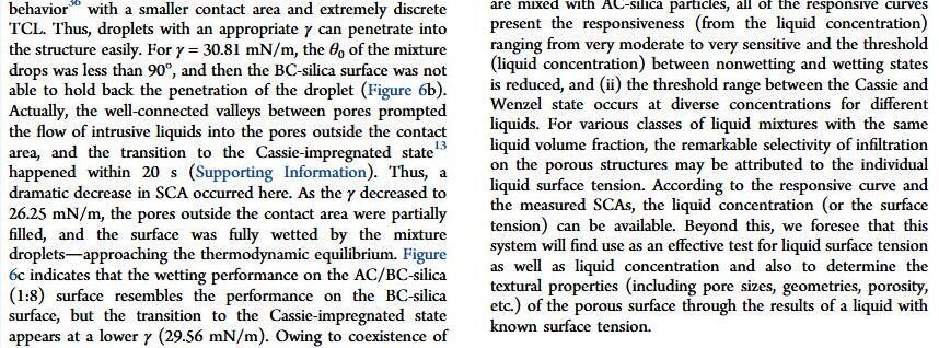 結果表明,以正矽酸四乙酯為前驅體通過酸性和堿性水解法製備了不同形貌的納米二氧化矽溶膠,通過混合兩種溶膠可製備出具有顆粒間鍵橋強度高的亞微米級凸起和納米級凹坑的結構的塗層。通過控製酸堿催化溶膠混合比例,91视频网址软件可以製備出具有不同微觀結構的超疏水塗層。結果表明具有不同結構的塗層具有不同的潤濕性-表麵張力關係,隨著塗層製備時堿催化溶膠的比重增加,納米級凹坑結構逐漸減少,表麵更容易被低表麵張力液體侵入,因而接觸角下降更劇烈。並且在有機物水溶液,包括:甲醇、乙醇、正丙醇、異丙醇、乙酸、丙酮、N,N’-二甲基酰胺等,都具有同樣的接觸角和濃度(表麵張力)響應規律。